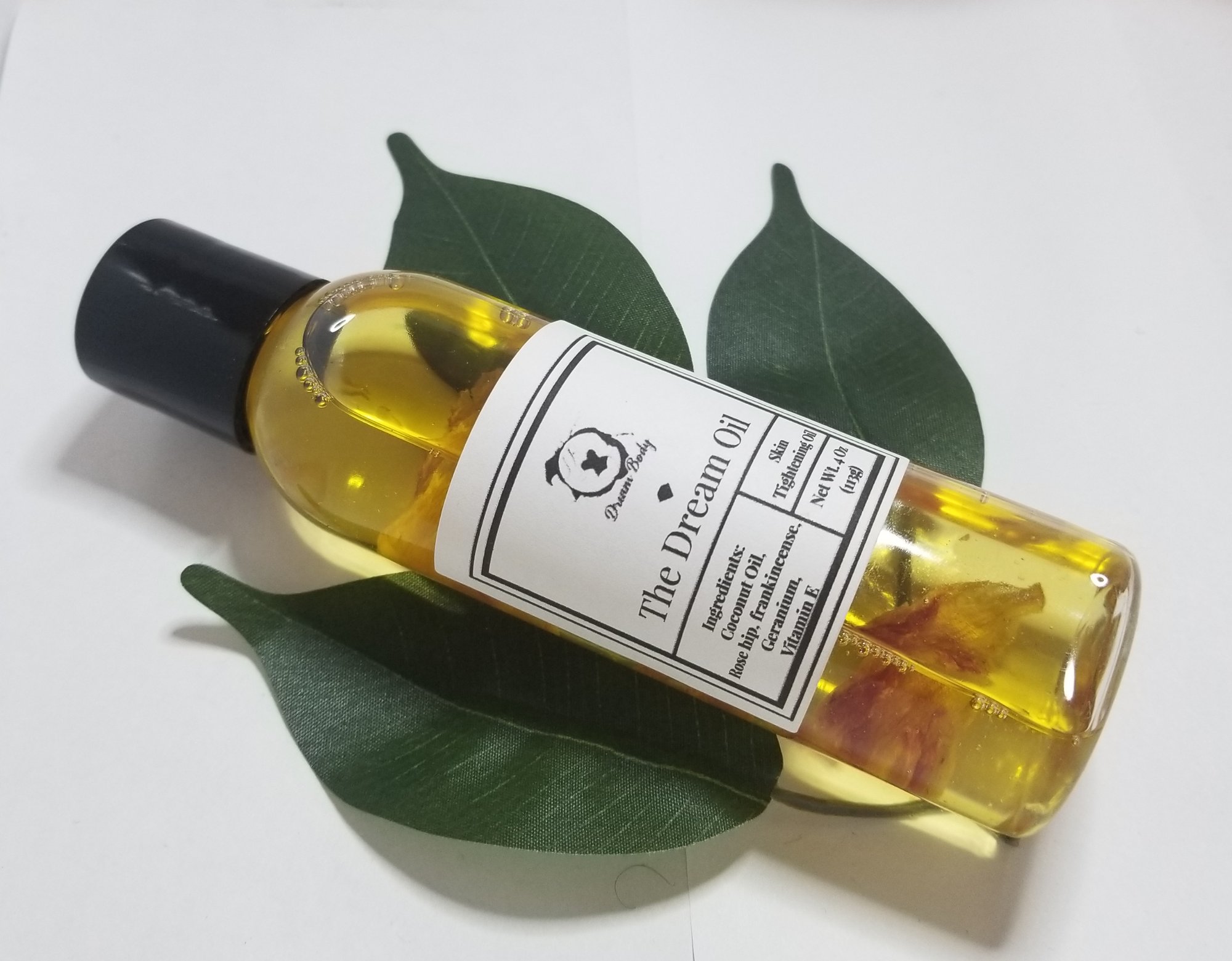 The Dream Oil is made with 100% essential oils in house by Dream Body. This oil is a skin tightener that helps to boost collagen levels within the skin which helps with the skins elasicity and retracting your skin. The oil comes in a 4oz bottle and will leave your skin feeling mosturized, soft, and tightened.